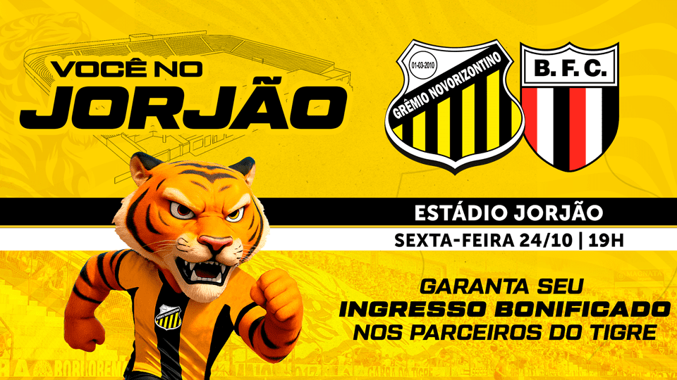 É reta final de Brasileirão B e cada partida se tornou uma grande final para o Grêmio Novorizontino na busca pelo inédito acesso à elite do futebol nacional. E o Tigre do Vale convida o torcedor de Novo Horizonte e região para fazer desse sonho a nossa realidade apoiando e incentivando o time no confronto com Botafogo, nesta sexta-feira (24), às 19 horas, no Estádio Jorge Ismael de Biasi, em Novo Horizonte. Novamente em parceria com seus patrocinadores, o Tigre do Vale disponibilizará um lote de 2 mil ingressos no setor de Arquibancada Geral para o torcedor embalar o Aurinegro em busca de mais uma vitória. O ingresso bonificado para adultos pode ser retirado a partir desta terça-feira (21) nos seguintes pontos da cidade: