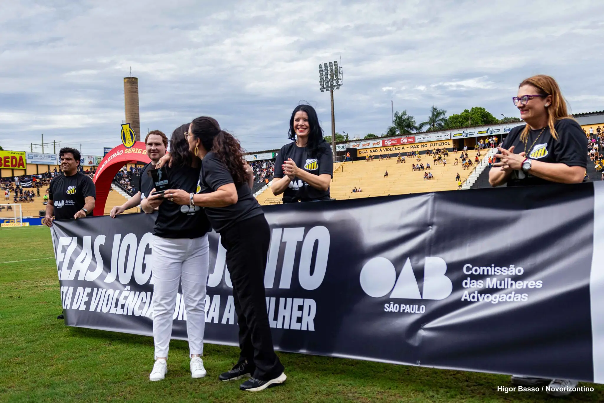 Voluntárias da Comissão deram uma volta olímpica exibindo a faixa com mensagem lema da campanha: “Elas Jogam Junto: Basta de Violência contra a Mulher”, reforçando o compromisso institucional com a igualdade de gênero e a segurança das mulheres também nos espaços esportivos. Uma mensagem no serviço de som e um vídeo da campanha também foram passados aos 3,7 mil torcedores presentes no Jorjão. Os jogadores do Novorizontino também posaram para foto com a faixa da campanha.